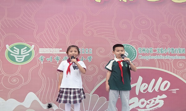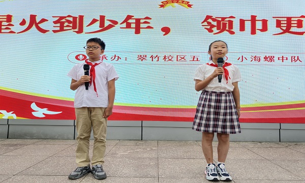 二实小翰学校区五(1)中队承办了本周的升旗仪式暨建队日活动,主持人赵允畅、恽知霖自信上台,用饱满有力的声音拉开了活动的序幕。