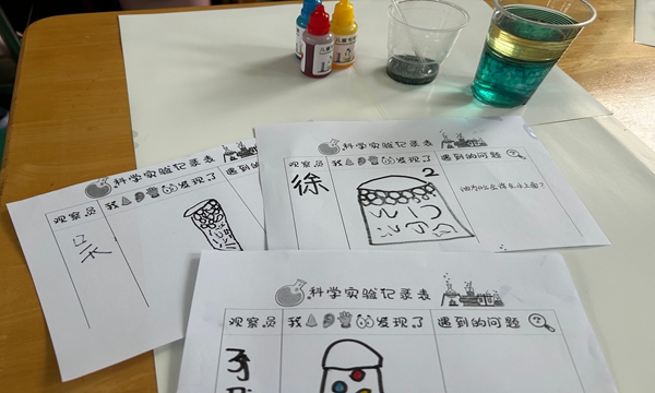 活动开始,孩子们了解实验材料及步骤。他们迫不及待开始操作,先在油中加入彩色色素,接着搅拌食用油中的色素。此时,孙孙小朋友发现色素都一粒粒泡在油中。随后,徐徐小朋友将色素油杯继续倒入清水中,搅拌后神奇的一幕发生了“看,下彩虹雨了”,只见色素一粒粒落进水中,变成了一条条“细雨”,油还浮在水面。孩子们认真观察杯中的变化,喜悦之情溢于言表,并把自己的发现记录下来。最后了解了实验原理:由于油的密度比水的密度小,所以油漂浮在水面上,而油中的颜料与其不相溶,但能与水相溶,颜料会因重力下降到水层,溶解扩散成彩虹雨的效果。
