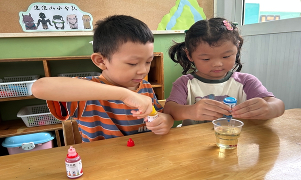幼儿通过直接感知、实际操作和亲身体验,用自己的肢体和各种工具探索和发现颜色神奇的一面,感受科学探究的乐趣。科学小实验为孩子带来喜悦的同时,也使孩子感受到科学并不是那么高深莫测,而是围绕在我们生活的方方面面。