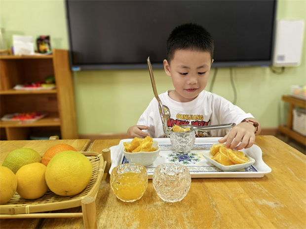 活动开始,老师先示范剥橘、榨汁的方法:将剥好的橘瓣放进手动榨汁器,轻轻按压手柄就能出汁。孩子们立刻跃跃欲试,小手捧着橘子瓣,小心翼翼地放进榨汁器。有的孩子力气小,便双手握住手柄使劲压;有的橘瓣卡住了,就学着老师的样子轻轻拨动,还互相鼓劲 “再加把劲就好啦”。橘汁顺着榨汁器流出,滴进透明杯子里,孩子们看着橘色的汁水,脸上满是期待。