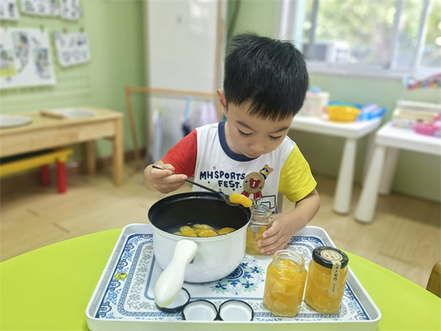 随后,老师将处理好的橘瓣倒入锅中,加入晶莹的冰糖,小火慢煮。孩子们围在灶台旁,睁着好奇的大眼睛观察,不时发出 “糖水冒泡泡啦” 的惊叹。待糖水熬好,师生协作将温热的橘子与糖水装进透明小罐,贴上专属标签。捧着自己制作的罐头,孩子们脸上洋溢着自豪的笑容。
