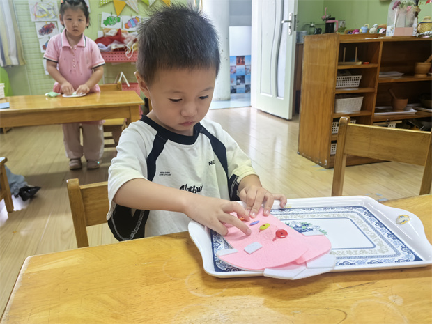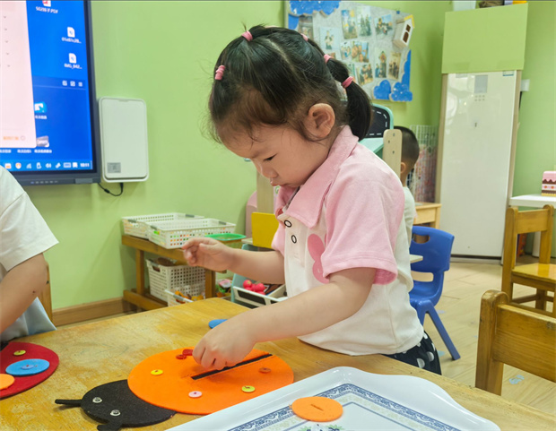 游戏桌上,彩色布片上的大纽扣吸引着孩子们。3 岁的希希盯着瓢虫造型的布偶,手指小心掰开扣眼,反复尝试后将纽扣稳稳扣入,兴奋地举起作品展示。旁边的蛋蛋则对着 “纽扣衬衣” 练习,眼神紧紧锁住纽扣,动作愈发熟练。