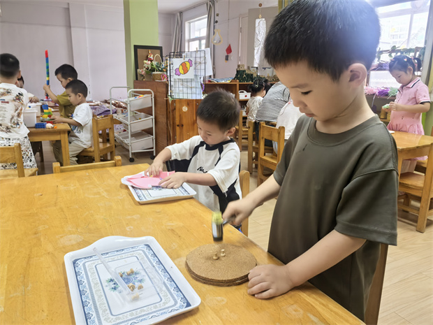 另一边,孩子们用安全木锤将塑料 “钉子” 敲进木屑板。小新屏住呼吸,一手扶 “钉” 一手挥锤,虽偶尔敲偏却不气馁,直到将所有 “钉子” 敲好才露出笑容。