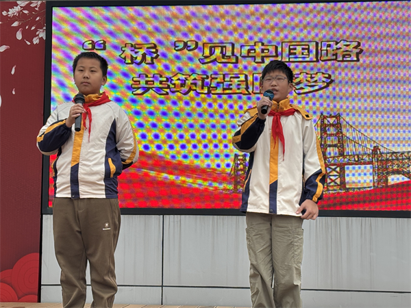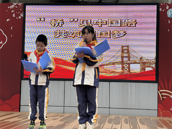 活动的最后环节,五(1)班同学带来了以“桥”为主题的诗文朗诵。他们声音洪亮,情感充沛,或赞美桥梁作为连接与沟通的纽带,或借桥寓情,抒发对祖国壮丽山河的热爱,或表达继承先辈遗志、刻苦学习、共筑民族复兴强国梦想的决心。激昂的文字与真挚的情感交织,赢得了全场热烈的掌声。