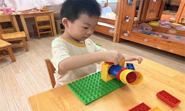 活动中,老师先通过生动的图片和实物相机展示,引导孩子们观察相机的外形特征——圆圆的镜头、方方的机身,还有能按下的“快门”,帮助小班宝贝们建立对相机的基础认知。随后,孩子们迫不及待地拿起手中的乐高积木,有的先挑选大块的基础积木搭建相机机身,有的专注地寻找圆形积木拼搭镜头,还有的尝试用不同颜色的小颗粒装饰相机,让自己的作品更具特色。搭建过程中,孩子们时而认真思考,时而互相交流:“我找不到圆形积木了,你能借我一个吗?”“我们一起搭一个大大的相机吧!”遇到搭建难题时,老师会耐心引导,手把手教孩子们如何将积木稳固拼接,鼓励他们大胆发挥想象。经过一番努力,一个个形态各异的乐高相机新鲜“出炉”:有的相机带着可爱的“耳朵”,有的相机机身布满彩色花纹,还有的孩子别出心裁地给相机加上了“背带”,仿佛下一秒就要带着它去记录幼儿园的美好瞬间。