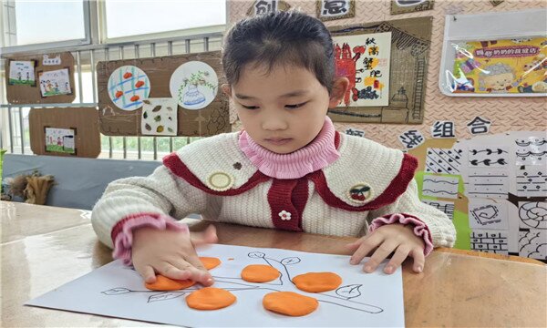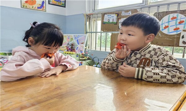 霜降也是吃柿子的时节,孩子们用橡皮泥按压出一个个圆圆的,大大小小的柿子,还品尝了清甜可口的柿子,孩子们吃的可美味了!