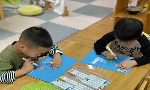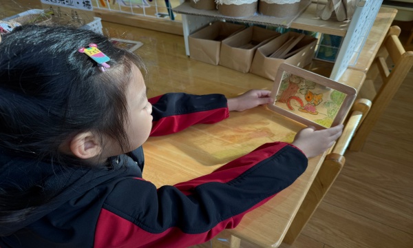 活动伊始,孩子们利用雪糕棒、胶水和透明纸制作了许多绘画相框。当孩子们完成后,拿起来欣赏的瞬间,竟然发现阳光透过相框将绘画图案投射在了桌子上,大家都觉得十分神奇,一起尝试了起来,光影成为连接美术与科学的纽带。