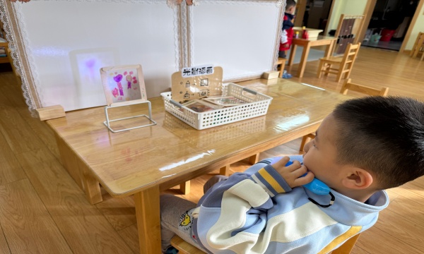 于是,我们抓住这个教育契机,在区域内也投放了游戏材料,供孩子们进行光影与雪糕棒的后续探索……