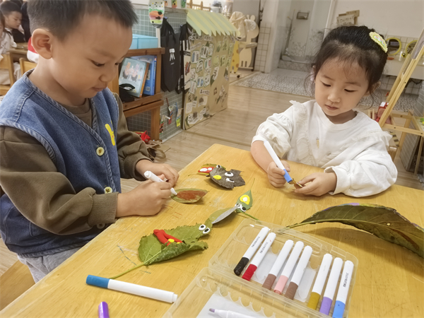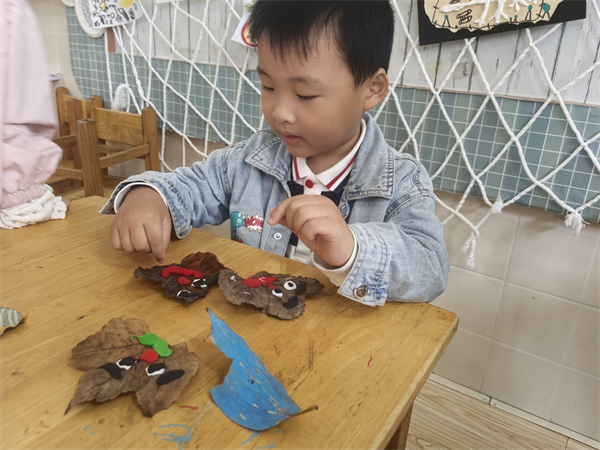 有的孩子选择用椭圆形的树叶做小鱼的身体,再用细长的树叶做尾巴,最后用黑色彩笔点上眼睛,一条灵动的 “树叶小鱼” 很快就完成了;有的孩子则将枫叶拼成了美丽的蝴蝶翅膀,搭配上彩色卡纸做的身体,栩栩如生;还有的孩子发挥奇思妙想,把不同颜色的树叶层层叠加,创作成了 “秋天的树林” 场景画。