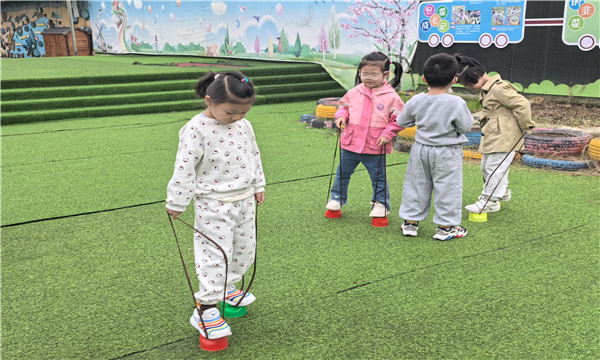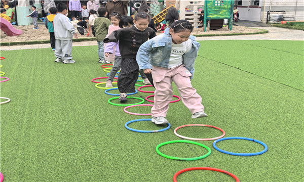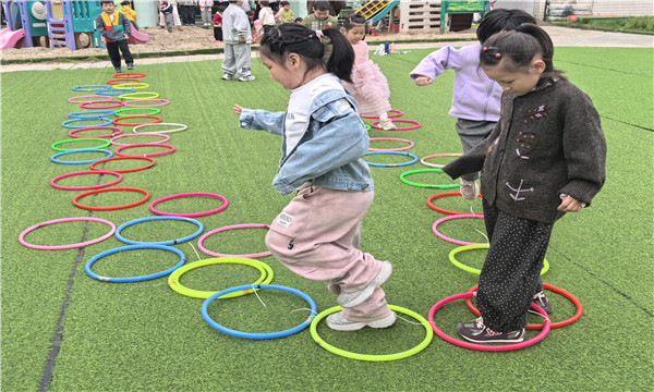 有的孩子玩起了踩高跷,他们双手紧紧拉住绳子保持平衡,在同伴的注视与鼓励下,一步步向前迈进。另一边,彩色的呼啦圈在草坪上摆成了有趣的图案,孩子们正在进行跳圈游戏,他们或单脚跳跃,或双脚齐跳,在色彩斑斓的呼啦圈阵中灵活穿梭,欢笑声此起彼伏。不仅锻炼了孩子们的肢体协调性,更让他们在奔跑跳跃中释放天性,感受运动的快乐。大一班的孩子们在欢乐的氛围中锻炼身体、培养合作意识,为美好的一天拉开了精彩序幕。(审核人:施云燕)
