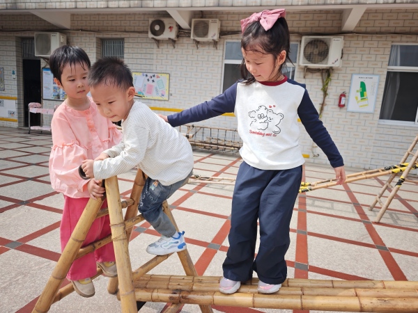 活动伊始,孩子们便迫不及待地冲向这片属于他们的“冒险乐园”。瞧!攀爬架前,几个孩子手脚并用,像灵活的小猴子,稳健地向上攀登。有的孩子寻求“最优路径”,试图以最快的速度登顶;有的则更享受过程,在每一个绳结处稍作停留,观察下方的伙伴,脸上洋溢着自豪的笑容。竹梯区域更是热闹非凡。孩子们不再满足于简单的攀爬,他们自发地想出了各种新玩法:将竹梯平放在地,变成有趣的“平衡木”,张开双臂,小心翼翼地走过;将竹梯以一定角度架在攀爬架上,瞬间又成了更具挑战的“彩虹桥”。最令人惊喜的是,他们展现了出色的团队协作能力。当一个孩子有些犹豫不敢上前时,身后的伙伴会大声鼓励:“加油,你可以的!”;当需要移动沉重的竹梯时,他们会自发地分工合作,“你来这边,我抬那边”,共同完成布置场地的任务。