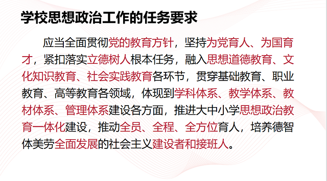 吴燕书记对《中国共产党思想政治工作条例》的制定背景、制定意义、内容框架以及《条例》对各领域思想政治工作的要求进行了解读,尤其对“明确学校思想政治工作”部分进行了详细阐述。