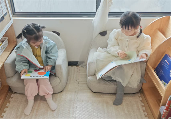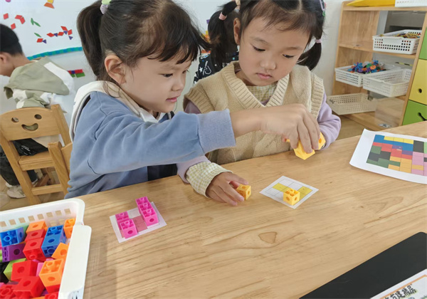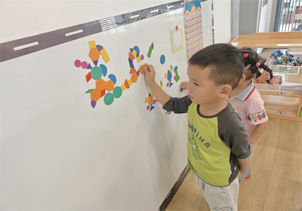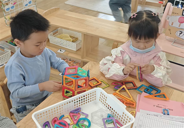 区域活动音乐响起,孩子们立刻活跃起来,有序地走向各个区域,整个活动室瞬间充满了活力。建构区里,一群孩子围在积木区,有的弯腰挑选积木,有的蹲在地上搭建,不时传来 “我们搭个大高楼吧”“这块积木放这里更稳” 的讨论声,大家你递我接,互相配合着调整积木的位置。图书区里,孩子们轻手轻脚地挑选绘本,有的盘腿坐在软垫上,没人大声喧哗,只有书页翻动的细微声响,安静又温馨。磁吸墙前有的拼搭出小房子,有的组合成小动物,不时互相借鉴想法,旁边孩子会点头称赞,还主动递去不同形状的磁片,大家在协作中玩得不亦乐乎,磁墙很快变成了五彩的创意天地。
