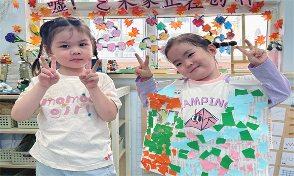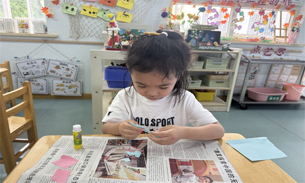 活动现场,孩子们围坐在桌旁,认真地忙碌着:有的小手捏着彩纸,仔细撕成细碎的装饰片;有的拿着固体胶,将彩纸小心翼翼地粘在报纸“衣料”上;还有的尝试给衣服添上可爱的图案,粉嫩的指尖在报纸上轻轻摆弄,专注的眼神里满是认真。从撕纸、粘贴到创意装饰,孩子们在自主操作中锻炼了手部精细动作,也学会了沉浸在创作里耐心尝试。随着制作深入,孩子们的“时尚交流”也热闹起来:“你看我的衣服有绿色小花!”“我帮你粘这个粉色的碎片好不好?”两个小朋友凑在一起,一人递材料、一人帮忙调整位置,原本普通的报纸渐渐变成了色彩斑斓的“小外套”。在你一言我一语的互动中,孩子们不仅体验了合作的乐趣,更在分享创意的过程中,悄悄播下了友谊的种子。