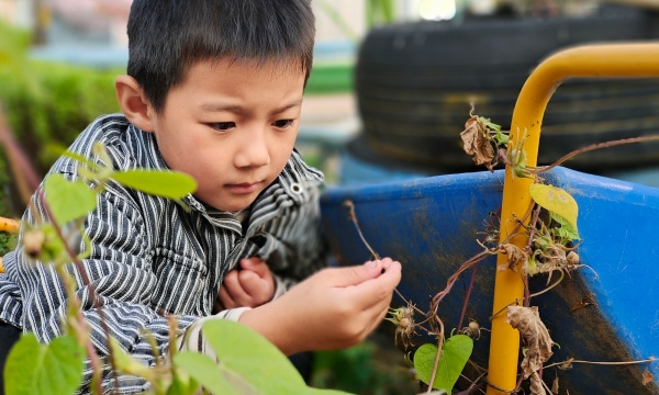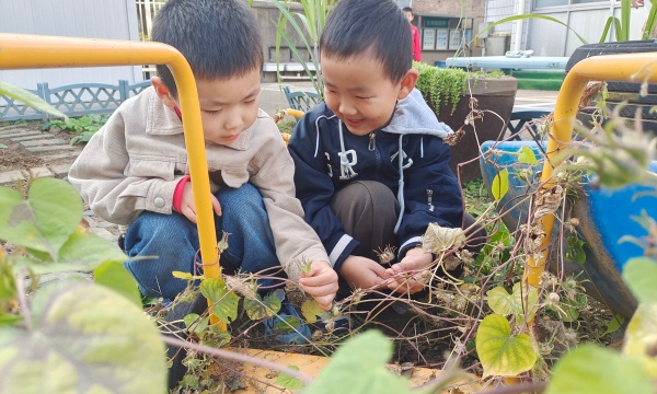 孩子们来到种植园地找到了牵牛花后便动手开始采收种子。“为什么这个种子是绿绿的,这个是灰灰的呢?”孩子们观察到不同成熟程度的种子有不同的颜色,老师进行了解答,进一步提升了孩子们关于植物的知识。