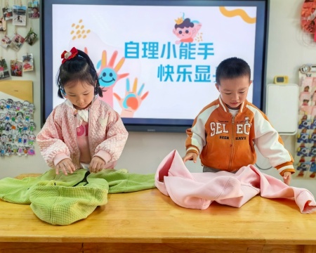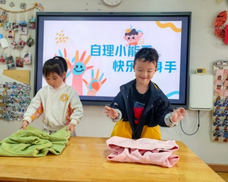 活动现场气氛活跃,孩子们全神贯注。有的孩子动作麻利,很快就掌握了技巧;有的孩子则略显生疏,但在老师耐心的手把手指导和同伴的鼓励下,也坚持完成了任务。老师们还精心设置了“叠衣服大比拼”的小游戏,让孩子们在轻松愉快的竞赛氛围中巩固所学,体验成功的喜悦。