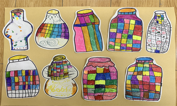 在“我设计的瓶子”创意画活动中孩子们用简单的点线进行构图装饰瓶子, 也会利用各种装饰材料对瓶子进行装饰,体验到了创造带来的无穷乐趣,更加认识到了“废物利用”的价值,增强了节约和环保的意识。