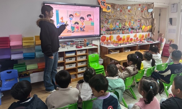 最受关注的是保健老师带来的“食物中毒应急演习”环节。保健老师先用简单易懂的语言告诉孩子们:“如果吃了不舒服的东西,出现肚子痛、恶心等症状,一定要第一时间告诉老师。”随后,老师邀请几名小朋友扮演“身体不适的小伙伴”,模拟出现腹痛、精神不佳的状态;其他小朋友则按照保健老师的指导,先举手告诉带班老师,再协助将“不适小伙伴”扶到旁边的休息区,同时保持安静不慌张。保健老师还现场演示了如何用温和的语气询问“哪里不舒服”“吃了什么东西”,并模拟联系校医室,让孩子们直观了解“遇到问题该找谁、怎么做”,将应急处理的步骤悄悄记在心里。
