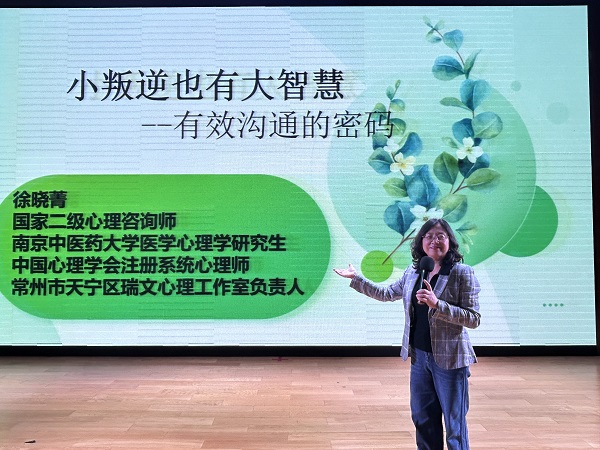 随后,全体家长移步学校报告厅,聆听由常州市天宁区瑞文心理工作室负责人、国家二级心理咨询师徐菁主任带来的专题讲座《有效沟通的密码》。徐主任从心理学角度出发,结合埃里克森的社会发展理论,深入浅出地解析了二年级孩子的心理特点与发展任务。她通过生动的案例,讲解了“共情倾听”“情绪识别”“赋能成长”等沟通技巧,引导家长在亲子互动中“学会听、学会看、学会不评判”,帮助孩子建立自信、学会负责。