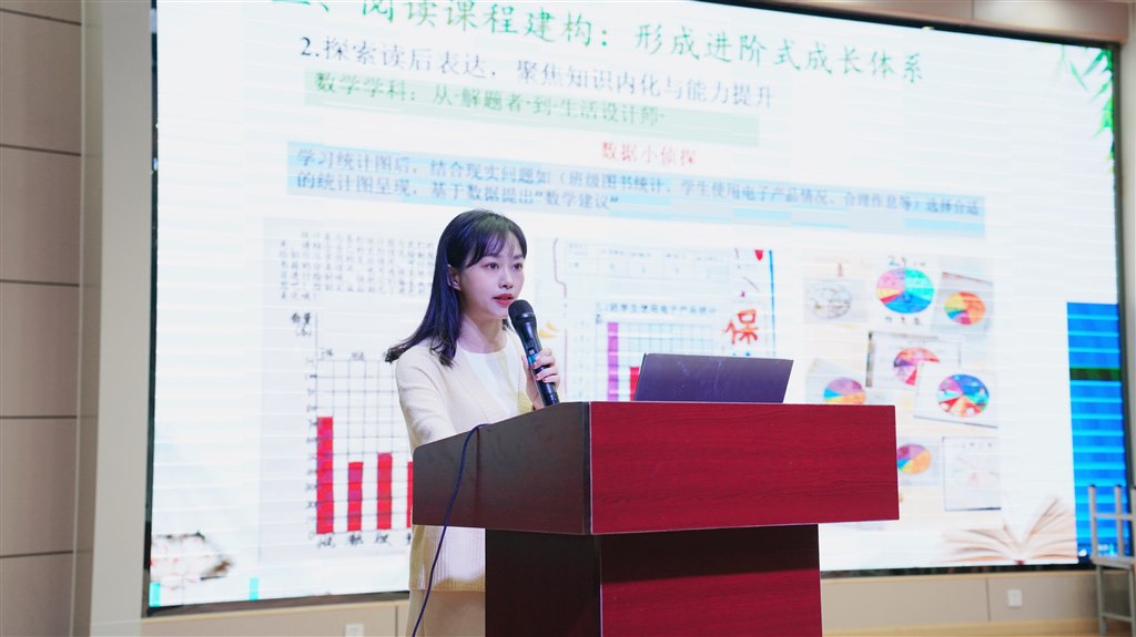 博爱教育集团丽华校区的黄蓓主任以“阅见万物,知行合一”为主题,分享了学校基于新课标的“阅读圈”项目实践成果。项目围绕“朋友圈、内容圈、资源圈”三维体系,构建跨学科阅读共同体,推动语文、数学、英语等学科深度融合。项目组引导学生从“读者”转变为“创作者”“生活设计师”和“文化体验官”,实现“做中学、创中学”,践行科学实践。学校还以节日、热点、校园特色为载体,开展丰富阅读实践活动,构建多元评价体系,全面提升学生阅读素养与综合能力。