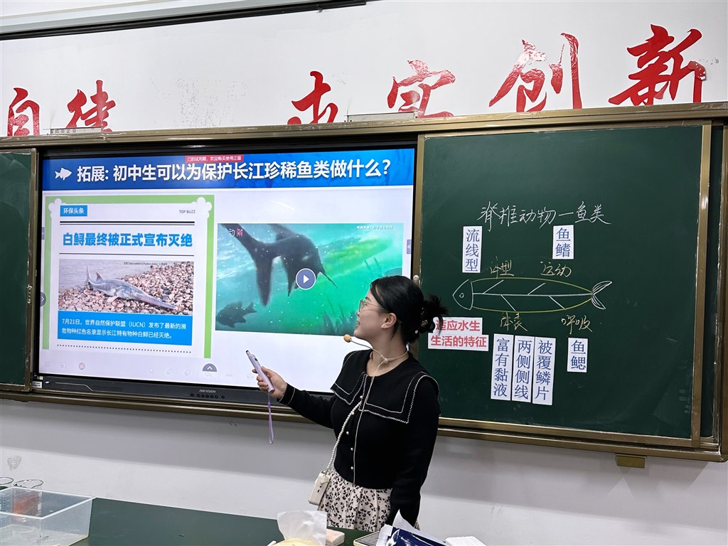紧接着,常州市正衡中学秦梦瑶老师开设一节《脊椎动物 — 鱼类》公开课,以“鱼类适应水生生活的特征” 为核心展开教学。整节课以长江白鲟的认识、救助、灭绝为情境线,兼具生物学科知识性与环保教育意义。课堂通过多环节的科学探究展开教学:先引导学生观察草种金鱼体表、体型等特征,再通过小组交流推测特征与水生生活的关系;随后借助生物兴趣小组的探究实验汇报,明确流线型、侧线感知水流的作用;紧接着,课上分组实验探究胸鳍、尾鳍、背鳍的运动与平衡功能;最后,利用红墨水演示、BTB 溶液检测、毛刷模拟实验等,清晰呈现鱼类用鳃呼吸的原理及气体交换过程。教学中融入长江生态保护知识,引导学生思考珍稀鱼类保护举措。