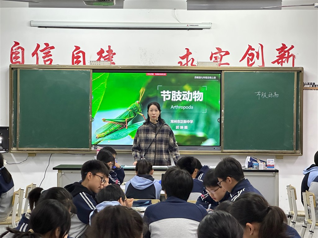 活动开篇,常州市初中生物兼职教研员於琳雅老师带来的《节肢动物》研究课,以 “2020 东非蝗灾” 的震撼影像拉开序幕,瞬间点燃学生探究热情。课堂上,於老师构建了 “观察 — 探究 — 思辨 — 传承” 的完整教学链条:在 “观察蝗虫结构” 环节,学生手持放大镜细致辨识蝗虫头胸腹分部特征并记录;“探究呼吸器官” 环节中,学生通过是否堵塞蝗虫气门的对照实验,直观发现气门的呼吸功能;随后的节肢动物标本观察环节,学生对比蝗虫、虾、蜈蚣等的形态差异,自主归纳出 “身体分部、外骨骼、附肢分节” 的共同特征;而 “节肢动物与人类关系” 辩论环节,正反双方围绕 “益虫授粉”“害虫毁粮” 等论点展开激烈交锋,将课堂氛围推向高潮。课程尾声,於老师讲述马世骏院士治理蝗灾的科研故事,将守护粮食安全的责任意识悄然植入学生心中。
