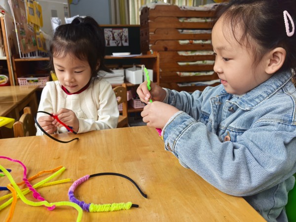 活动中,老师首先向孩子们介绍了扭扭棒的特点和制作发箍的基本方法,并鼓励小朋友们发挥想象力,制作出独一无二的作品。孩子们争相拿起材料,缠绕、弯折、拼接间,彩色扭扭棒渐渐“变身”:有的专注做出对称兔耳,有的将粉紫两色扭成层叠花朵,还有的互相交流、为创意点赞。活动室里笑语不断,普通扭扭棒在孩子们手中成了独一无二的发箍。