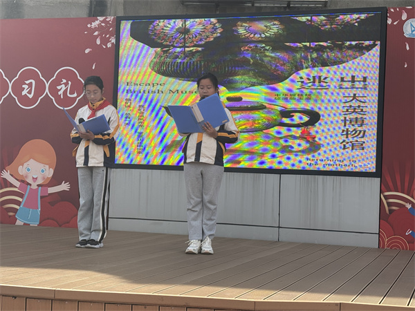 仪式伊始,五2班同学以近期风靡网络的《逃出大英博物馆》情景短剧为切入点,通过生动的讲述,将大家的思绪带到了远在万里之外的大英博物馆。主持人简要介绍了其中部分中国文物的流失背景,讲述了它们如何在近代历史变迁中远离故土的沧桑历程。这一段历史回顾,不仅让同学们了解了文物背后的民族伤痛,更激发了大家对文化遗产保护意识的深刻思考。