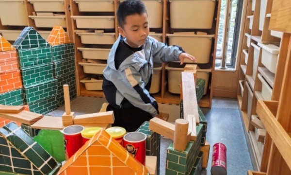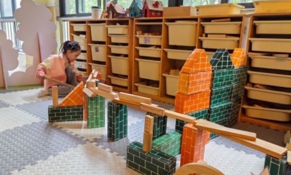 从构思到施工,一场思维的碰撞工程伊始,小建筑师们并没有急于动手。他们首先围坐在一起,你一言我一语地讨论设计图。“这里要有一个大转弯,不然车子开太快会飞出去!”“我们需要很多很多圆柱积木来做桥墩,这样桥才稳!”“下面还要留出空间给小汽车通过!”激烈的讨论中,工程的雏形逐渐清晰。随着“总工程师”一声令下,搭建工作正式启动。孩子们自发形成了不同的工程小组:“地基组”的孩子们负责用大型单元积木和奶粉罐搭建坚实、对称的桥墩,他们深知“万丈高楼平地起”,桥墩的稳固是成功的关键。“桥面组”的孩子们则小心翼翼地将长条木板架在桥墩上,他们不断测试桥面的平衡与承重,确保“车辆”能平稳通过。“交通组”的成员们最是细心,他们用小型积木和雪花片制作了交通标志、路灯和绿化带,甚至还设计了匝道和分流口,让整个高架桥系统看起来既科学又逼真。