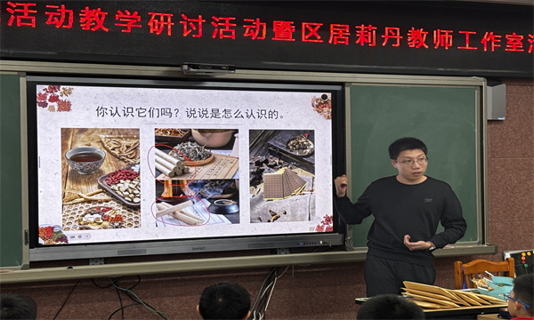 随后,博爱小学的钱聪老师执教了《学做中药小香囊——我是非遗小传人》。钱老师从艾条、汤药及膏药出发,带领学生从记忆里感受中医非遗。随后,通过闻香囊、摸药材、识药性、配药方、包香囊的一系列环节,由表及里,由浅入深地了解中草药特性,体悟中药搭配的内在逻辑,感受非遗魅力。