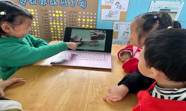 晨晨说:“我见过观光车,上面可以坐好多人。”“我出去旅游的时候见过敞篷车,上面可以打开看风景。”骍骍说道。“圆柱形的积木可以做轮胎......”孩子们结合汽车的特点及自身想法,选择适宜的材料开始搭建。“停车厂是一块一块的,每辆车都有停车位。”亮亮补充道。孩子们分工合作,有的继续完善汽车的搭建,有的划分停车位。回到教室,孩子们分享自己的搭建作品及想法。最后,教师借助AI技术,将孩子们设计的汽车动起来,大家兴奋不已。