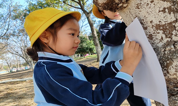发现大树之美活动开始了,孩子们在老师的带领下走进了新龙生态林的树林里,开启了一场与大树的亲密对话。他们用小手触摸粗糙或光滑的树皮,感受着大树的温度;用眼睛观察树干的形状、树枝的分布,聆听风穿过树叶的沙沙声。孩子们兴奋地分享着自己的发现:“这棵树的树皮像爷爷的皱纹!”“树枝像在跳舞!”通过观察,孩子们对大树的结构和特征有了更直观的认识,也激发了他们对自然的好奇心。