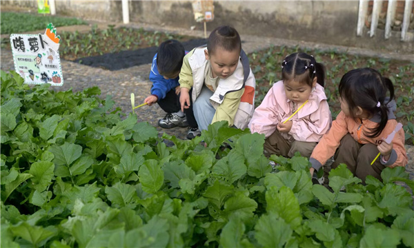 11月11日早晨,红梅东村幼儿园小班孩子们在菜地里惊喜发现萝卜,开启了一场生动有趣的自然探索之旅。萌娃们小心翼翼地拨开绿叶,轻轻拔出萝卜,兴奋地观察着这些形态各异的白萝卜。
