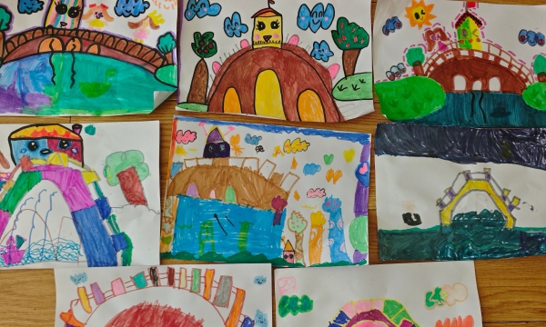 影片观看结束后,老师们应势利导组织开展了创意实践活动:孩子们用积木搭建“家乡的桥梁”,用画笔勾勒出眼中的龙游河桥景,在动手创作中孩子们深化了对桥梁文化的理解。