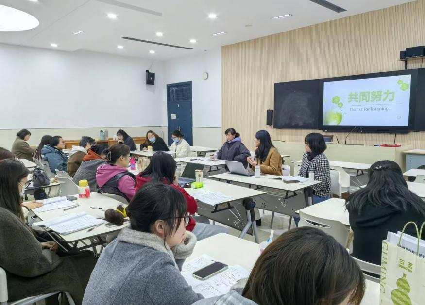 在集中研讨环节,全体教师围绕课堂展示与专题讲座展开热烈交流,思维碰撞中凝聚教学共识。杭老师结合活动内容就三年级新教材的相关课时教学设计提出建议,她指出教师要立足单元整体,从整体入手处理教材文本,基于学生学情改进词汇教学方法,以提高课堂效率及学生的思维能力,为片区教师精准把握教材、优化教学设计提供了关键指导。