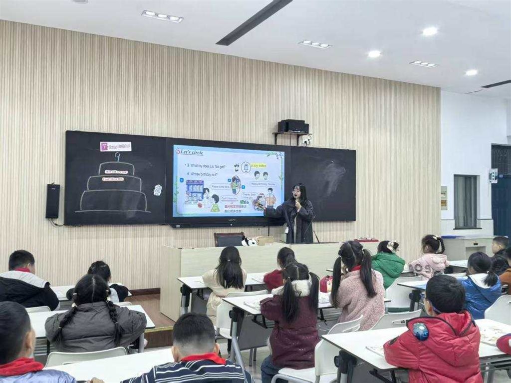 活动伊始,紫云小学管春艳老师带来三年级上册《Happy birthday(Lead-in& Cartoon time)》研究课。管老师以刘涛的生日儿歌、鲍比的生日故事为两大趣味载体,设计贴近学生生活实际的教学活动。学生在“看气球说数字”“数物品数量”等直观互动中,轻松掌握一到十的数字类单词;通过看图片猜词、小组对话、模仿朗读等丰富活动,自然习得生日常用表达,实现语言运用能力与合作意识的同步提升。管老师还鼓励学生结合自身实际分享生日愿望,让课堂既有知识输入,又有情感表达。整堂课氛围轻松活泼,不仅高效达成了语言知识目标,更充分激发了学生的英语学习兴趣,切实提升了他们的口语表达能力。