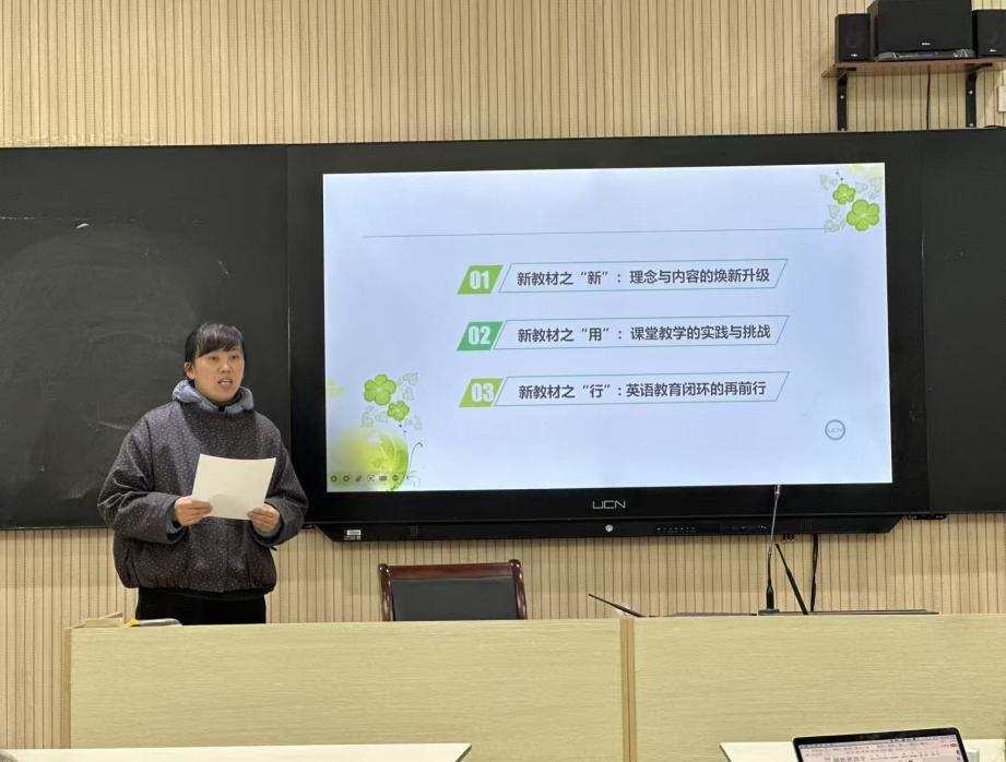 最后,雕庄中心小学的曹燕副校长以《新教材使用之我见》为题开展讲座。她从理念焕新、课堂实践与教育闭环三个维度,全面剖析了新教材带来的变革与挑战。结合何锋老师提出的一些新教材使用建议,她提出“进一步悟透教材”的实践路径,在明确各板块功能定位的基础上构建起“教—学—评”一致的教学体系。她鼓励教师利用教材中的主线人物与情境,增强学生的“故事陪伴感”;在语篇教学中坚持“意义先行”,强调整体理解;在复习与评估阶段注重结构化梳理与真实语境迁移,推动学生从“学会”走向“会学”。