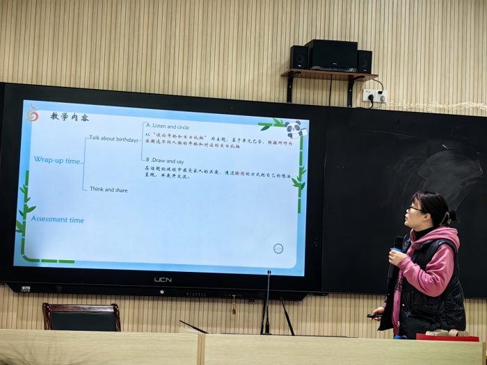 随后,红梅实验小学的庄小燕老师带来三年级上册《Unit7 Happy birthday(Wrap-up time)》的说课。本节课围绕“生日”主题,以单元大问题为主线,融合听、说、画、演等多种形式,引导学生深入理解并运用语言。教学设计层次分明,从歌曲导入激活旧知,到情境表演回顾课文,再到综合活动“Draw and Say”引导学生表达感恩,层层推进,突出“以生为本”,关注语言学习与情感教育的融合,不仅提升学生综合语用能力,更在潜移默化中传递爱与感恩,体现了英语学科的育人价值。