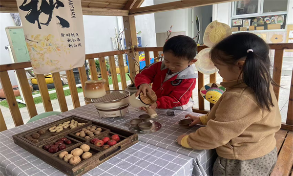 活动中,孩子们围坐在小桌旁,桌上的分食盒里摆满了花生、核桃、红枣等应季干果,陶制茶具、暖炉更添温馨氛围。幼儿们相互为同伴斟茶,在“递一递”“尝一尝”的互动里,既体验了传统待客礼仪,也感受着分享的快乐。一旁悬挂的挂饰、手工编织挂饰,让整个茶话会都浸在茶话会的温柔里。