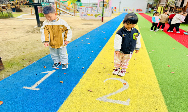 活动开始,老师通过多媒体课件,以“数字躲猫猫”为主题,用生动的画面和有趣的故事,引发了孩子们对数字的好奇与探索欲。在户外的彩色步道上,孩子们化身“数字侦探”,认真地在不同颜色的步道上寻找数字“1”“2”的踪迹,而在娃娃家,孩子们在模拟厨房玩具上,也仔细观察着与数字相关的标识,将数字认知自然融入游戏场景。