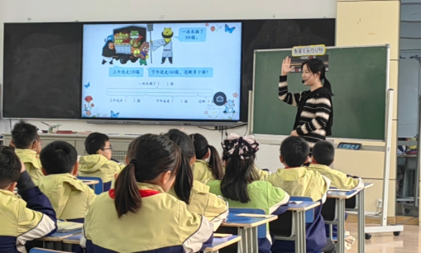 三年级的课堂,思维的含量进一步提升。老师们通过创设连贯的故事情境,引导学生学会两把“金钥匙”:从条件想起和从问题想起。学生们在老师的启发下,像小侦探一样,梳理题目中的已知条件,明确要解决的问题,然后寻找条件与问题之间的桥梁,逐步画出线段图,列出数量关系式。