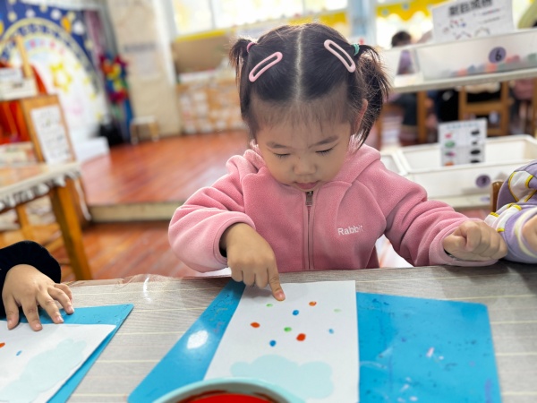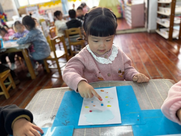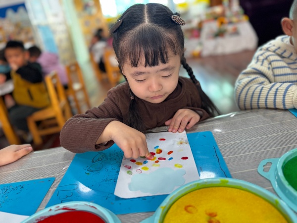 准备工作就绪,孩子们一个个跃跃欲试。老师为孩子们准备了红、黄、蓝、绿等多种颜料。当孩子们伸出小小的食指,小心翼翼地蘸上颜料,再轻轻点在洁白的画纸上时,一个个圆润、可爱的“彩色雨滴”便诞生了!他们全神贯注,时而用力点下一个大大的“雨点”,时而轻轻触碰,留下细密的小雨滴。有的孩子将不同颜色的雨滴错落有致地排列,仿佛一首跳跃的色彩乐章;有的则大胆地将颜色叠加、融合,创造出属于自己的独特色彩。