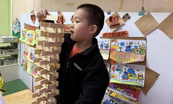 活动中,孩子们化身“小小建筑师”:有的两两合作,用木块堆叠出多层结构的“塔楼”,专注地调整每一块积木的角度;有的独自探索,尝试用交错的木块搭建出稳固的“桥梁”,脸上写满认真;还有孩子大胆挑战,将积木搭成高高的“斜塔”。