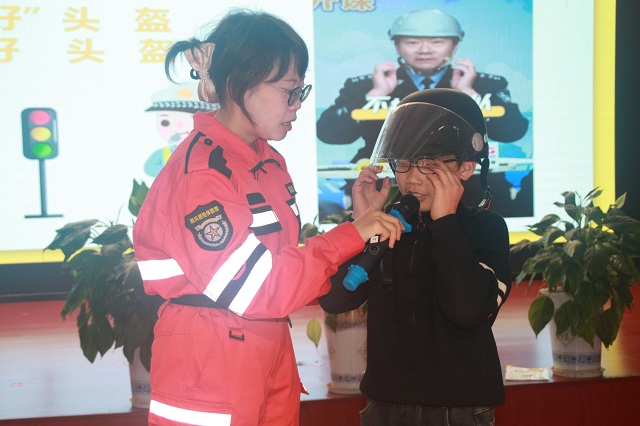 在消防安全板块,讲师借助生动视频,直观展示乱扔烟头、杂物堆积等火灾隐患。通过情景示范,分步讲解火灾逃生要点:保持冷静拨打119,用湿毛巾捂口鼻弯腰低姿撤离,通道受阻时挥动鲜艳衣物、抛软体信号物或夜间打手电求救。还介绍了防烟面罩的使用方法,让学生上台模拟佩戴,学习火场逃生技能。