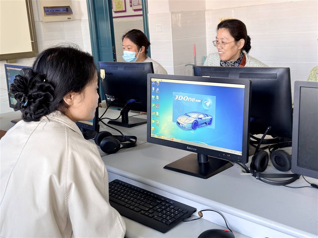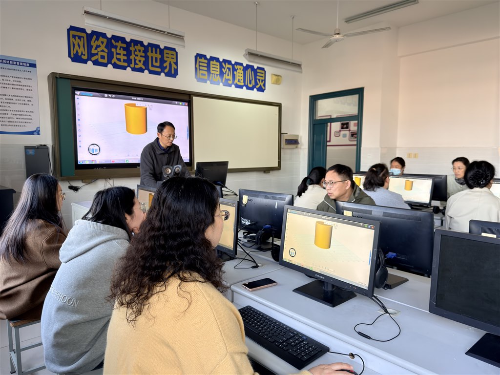 在随后的实践环节中,教师们移步多媒体网络教室,开展3D打印设计与制作实操。在李志伟主任的指导下,大家运用3Done建模软件,结合学科教学需求与创意构思,精心设计3D笔筒模型。从尺寸调整到细节优化,从软件操作到参数设置,教师们积极交流、协作探索,沉浸式体验了“创意设计—数字建模—实物生成”的完整创客流程。