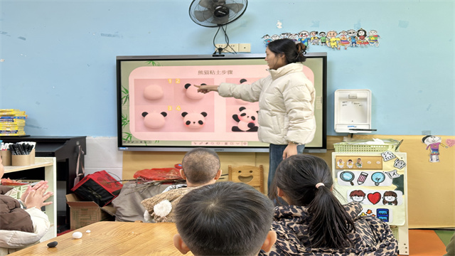 活动中孩子们先了解了大熊猫的来历:作为中国特有的珍稀动物,大熊猫曾广泛分布于中国南方,如今主要栖息在四川、陕西等地的山林中,因憨态可掬的外形成为世界公认的“中国名片”。老师通过图片、短视频展示大熊猫的外形特征——黑白相间的毛发、圆圆的脸颊、标志性的黑眼圈和胖乎乎的体态,生动的讲解激发了孩子们的创作兴趣,大家纷纷跃跃欲试。