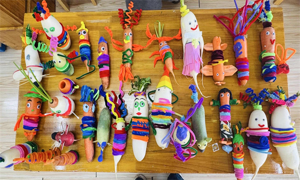 活动现场,老师们提前准备了胡萝卜、白萝卜、青萝卜等多种食材,以及剪刀、彩纸、胶水、牙签等辅助材料。在老师的简单示范和讲解后,家长们带着孩子迅速投入创作。有的家庭将胡萝卜切成小块,拼搭成可爱的小兔子;有的用白萝卜做身体,搭配彩纸装饰成漂亮的花朵;还有的发挥奇思妙想,把不同颜色的萝卜组合成小火车、小房子等趣味造型。