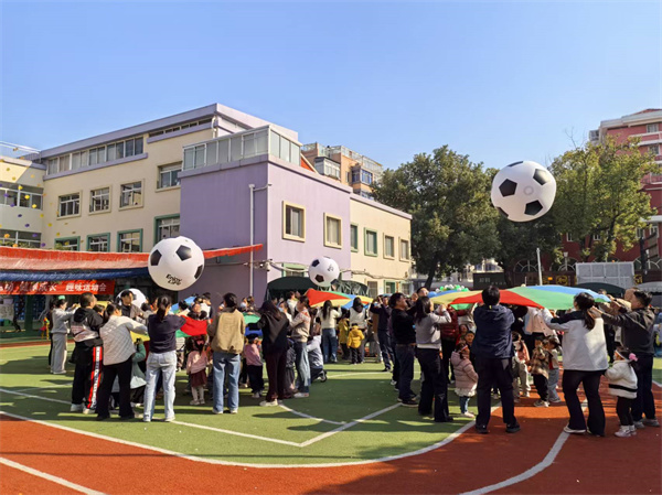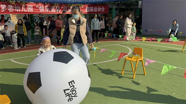 运动会设置了“听令夺球”“接力运球”“萌娃赶球”等贴合小班幼儿的趣味项目。“听令夺球”中,家长和孩子并肩等待指令,抢到球后的欢呼此起彼伏;“接力运球”里,亲子接力传递皮球,家长弯腰配合孩子的高度,默契的衔接让每组都顺利完赛;“萌娃赶球”时,孩子们拿着呼啦圈小心翼翼赶动足球,家长在旁轻声指导,偶尔球跑偏时的笑声格外清脆。家长们全情投入,与孩子尽情嬉戏,操场瞬间成为欢呼声与笑声交织的欢乐海洋,老师们则全程在场边指导并记录温馨瞬间。
