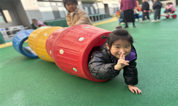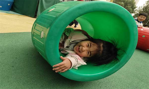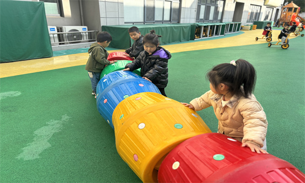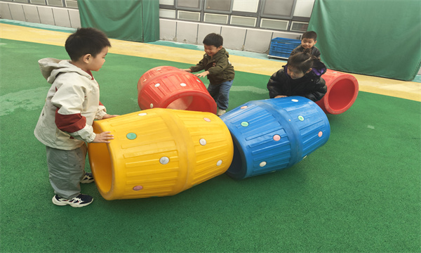 活动伊始,孩子们各自挑选喜欢的滚筒,开启了个人的探索之旅。有的孩子将滚筒轻轻推动,看着它咕噜噜地向前滚动,兴奋地追逐;有的孩子则好奇地钻进滚筒,感受被彩色包围的奇妙,脸上洋溢着满足的笑容。随着活动的推进,孩子们不再满足于单人游戏,自发地开启了合作模式。他们齐心协力,将红、黄、蓝、绿等多种颜色的滚筒小心翼翼地拼接起来,你扶着这一端,我调整那一头,在大家的共同努力下,一条绚丽的“彩虹隧道”逐渐成型。“彩虹隧道”搭建完成后,孩子们迫不及待地开始了钻爬游戏。他们像灵动的小精灵,在隧道中穿梭、嬉戏。有的孩子还会在隧道里对着镜头比出可爱的“剪刀手”,留下欢乐的瞬间。而在隧道外,总有几个贴心的孩子主动帮忙扶着滚筒,确保钻爬小伙伴的安全,嘴里还喊着:“慢一点,小心哦!”