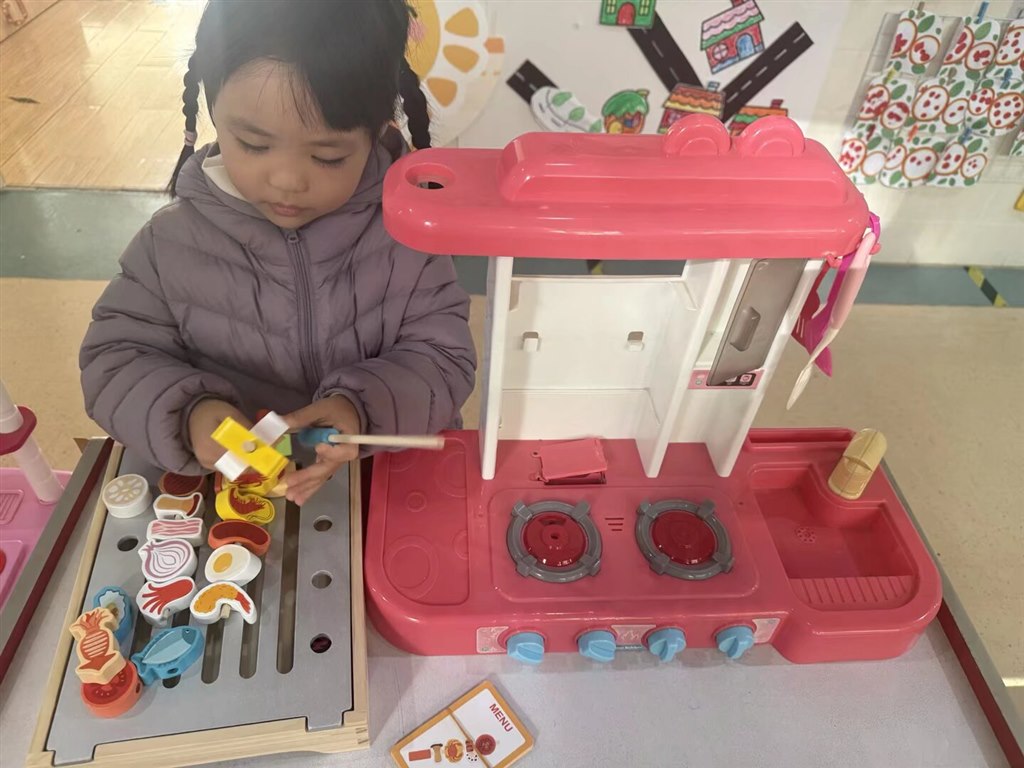 区域里的粉色厨具、木质“食材”、菜单卡片,成了孩子们的“戏剧道具”:扎着麻花辫的小朋友正用筷子夹起“烤串”,认真地摆在“烤架”上;穿米白外套的小男孩盯着“灶台”,跟着墙面上的“做饭流程”一步步操作;还有戴着兔子眼镜的小朋友,举着粉色锅铲在“水槽”边“洗碗”……